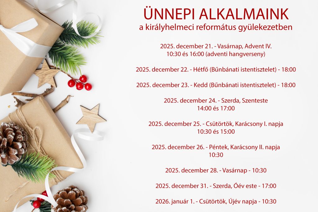 2025. december 21. – Vasárnap, Advent IV. – 10:30 és 16:00 (adventi hangverseny)2025. december 22. – Hétfő (Bűnbánati istentisztelet) – 18:002025. december 23. – Kedd (Bűnbánati istentisztelet) – 18:002025. december 24. – Szerda, Szenteste – 14:00 és 17:002025. december 25. – Csütörtök, Karácsony I. napja – 10:30 és 15:002025. december 26. – Péntek, Karácsony II. […]